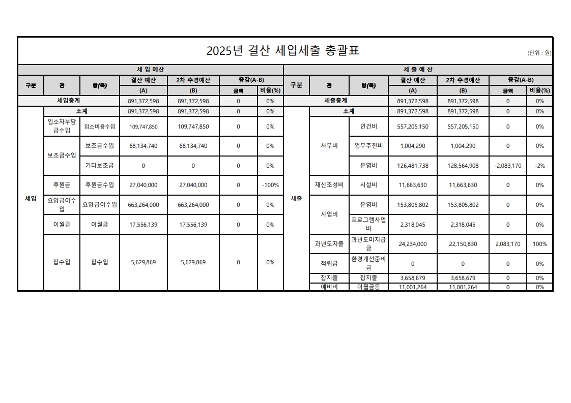 2025년도 세입세출 총괄표 및 세입세출 상세내역