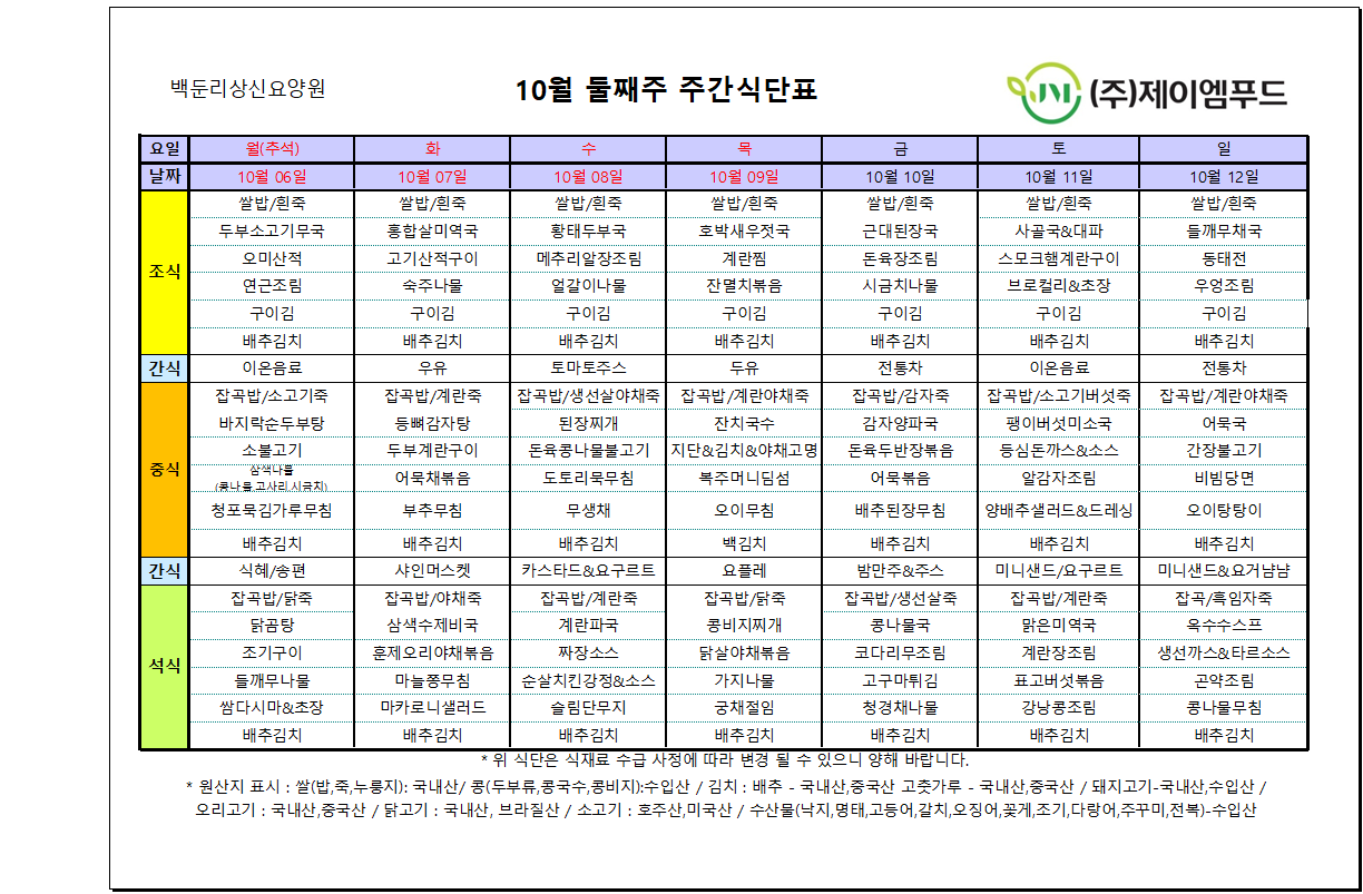 2025년 10월 둘째주 식단입니다.