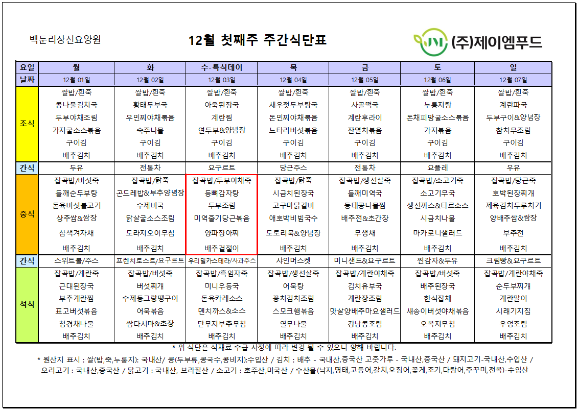 2025년 12월 첫째주 식단